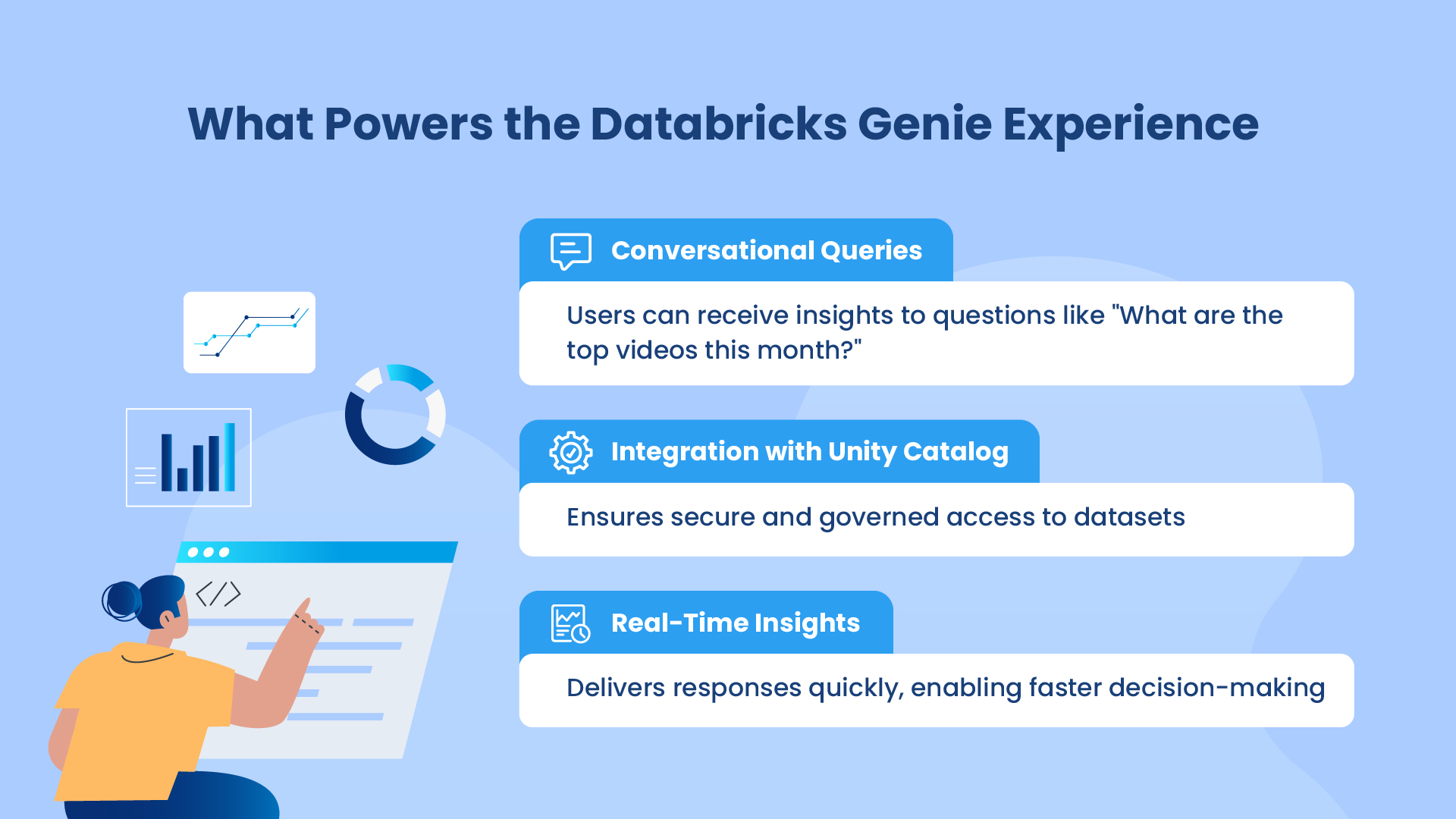 Databricks Genie is an advanced conversational AI feature integrated into the Databricks Lakehouse ecosystem. It enables users to query data in natural language, transforming complex data analysis into an intuitive process. Genie is particularly beneficial for non-technical users, analysts, and engineers, as it democratizes access to insights without requiring deep technical expertise.