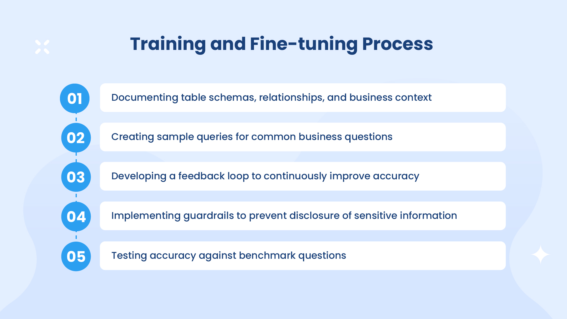 Rather than traditional model fine-tuning through weight adjustments, we employed a contextual training approach. This involved providing Genie with comprehensive context about available tables, their relationships, and sample queries. The training process included: