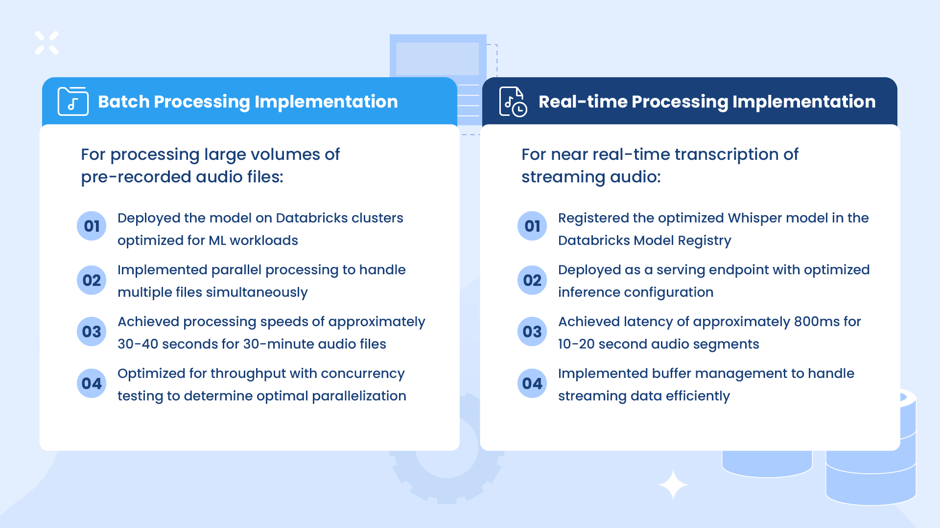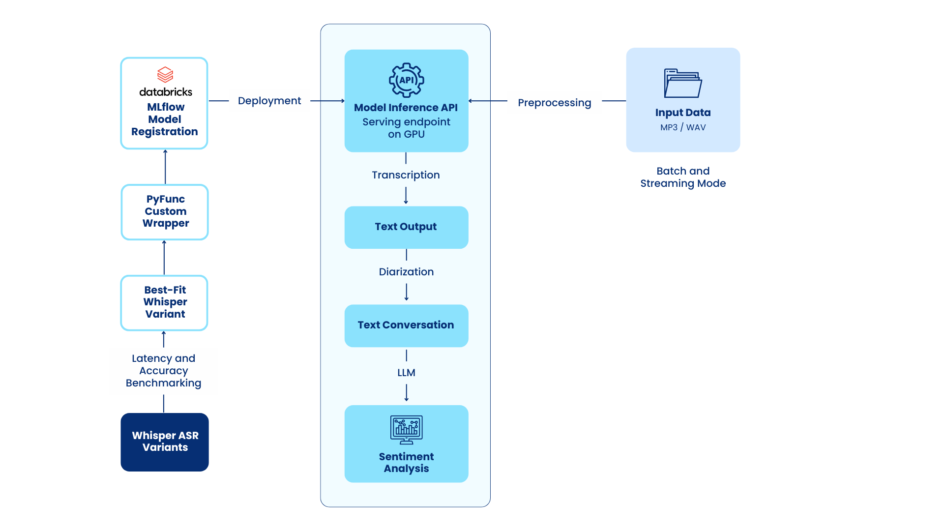 The second use case involved developing a high-performance speech-to-text transcription pipeline for analyzing audio content. We evaluated multiple Whisper model variants: