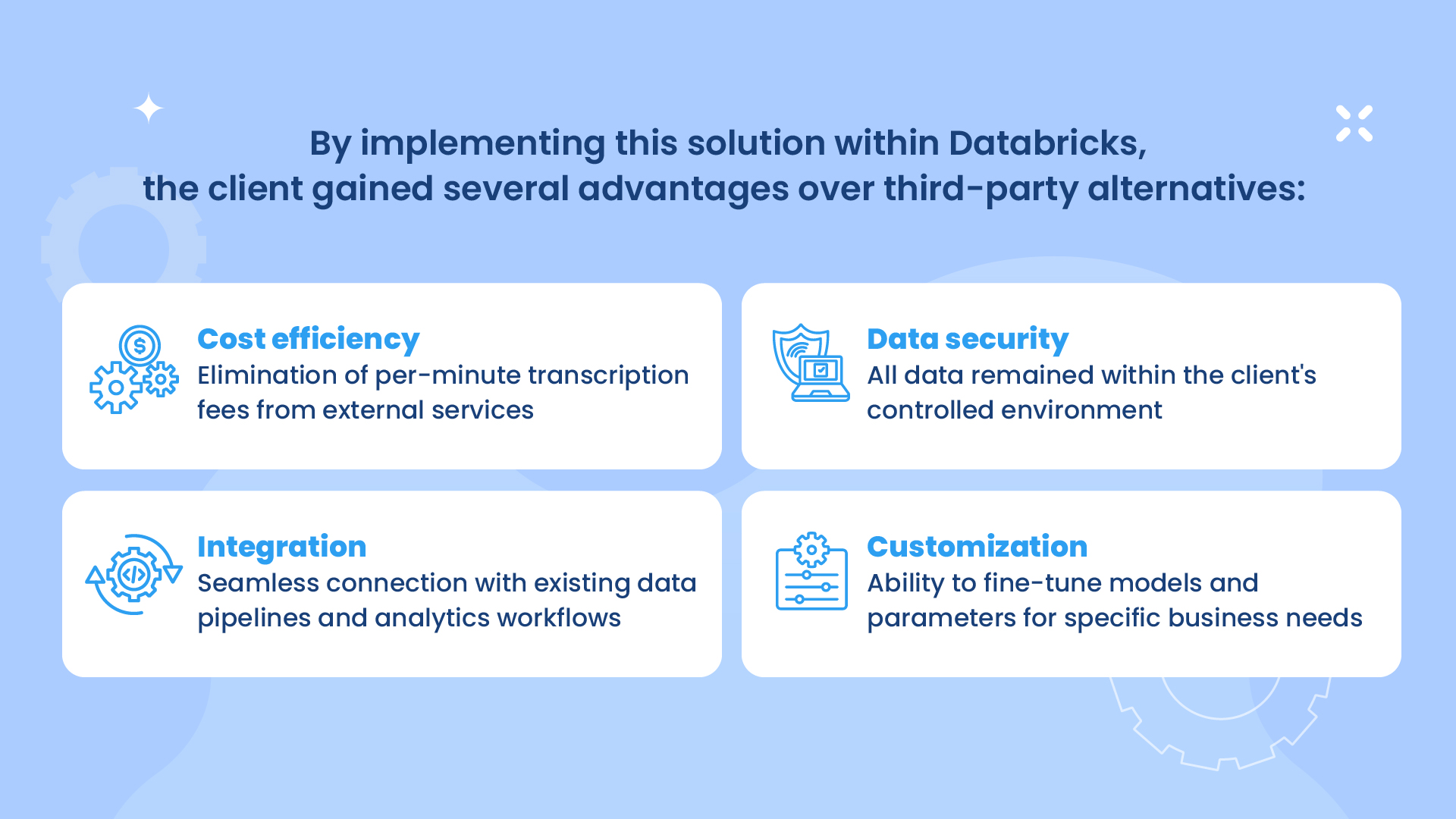 - Enhanced security: Leveraging Databricks' security framework rather than exposing data to external systems
