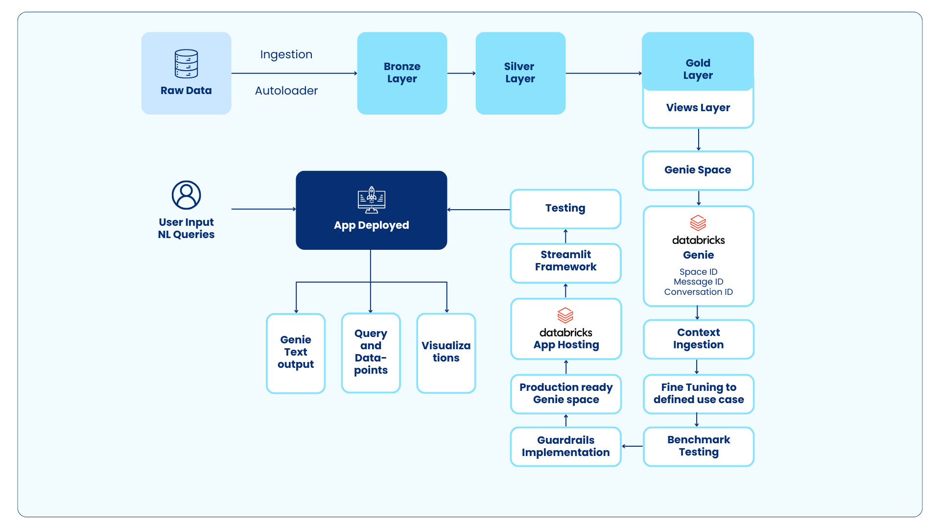 The deployment architecture follows a pattern like the Streamlit demonstration with Databricks SQL shown in search result but extended to incorporate the Genie Conversation API for natural language processing.