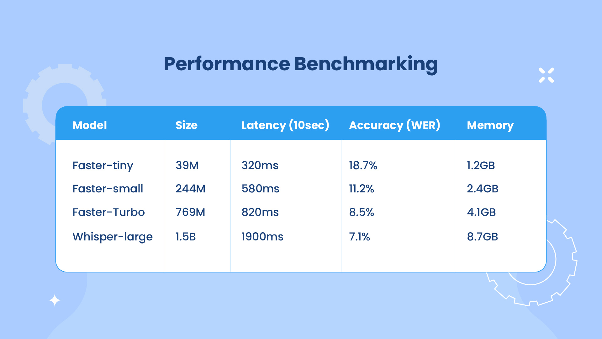 - Beam search optimization: Fine-tuned beam search parameters for optimal accuracy/speed tradeoff